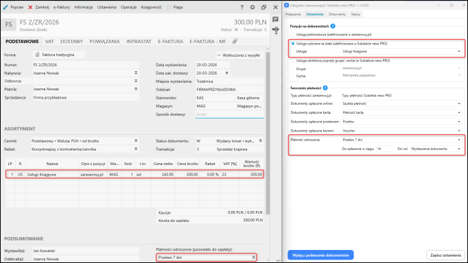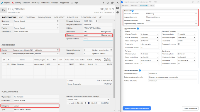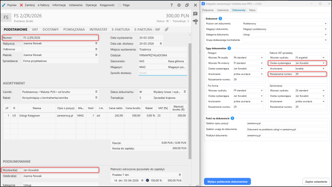 W przypadku Faktury sprzedaży ustawiono rozszerzenie numeru dokumentu ZR oraz wskazano Jana Kowalskiego jako osobę wystawiającą dokumenty.