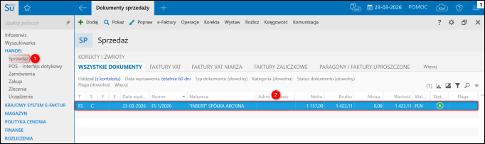 1. Przejść do modułu Handel – Sprzedaż i zaznaczyć pozycję na liście.