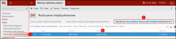 1. Przejść do modułu KsięgiRozliczenia międzyokresowe, uruchomić zakładkę Zbiorcze naliczenia rozliczeń międzyokresowych i zaznaczyć pozycję na liście.