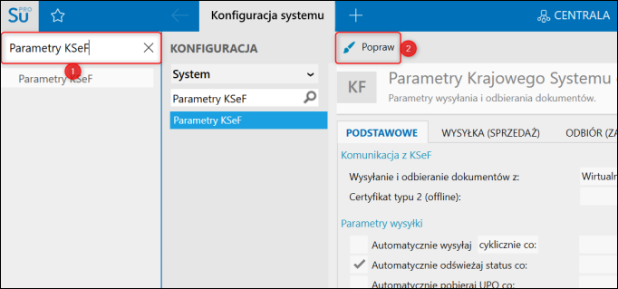 1. Wyszukać i przejść do Parametrów KSeF, a następnie kliknąć Popraw.