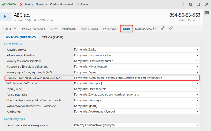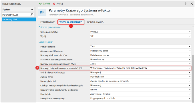 2. Na zakładce Wysyłka (sprzedaż) wybrać jedną z opcji w parametrze Numery i daty realizowanych zamówień (ZK). Parametr ten określa, który numer zamówienia będzie wykazywany na e-Fakturze. Zmiany zapisać.