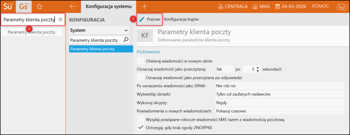 1. Wyszukać i przejść do Parametrów klienta poczty, a następnie kliknąć Popraw.