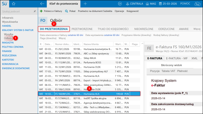 1. Przejść do modułu KSeFOdbiór, uruchomić zakładkę Do przetworzenia i zaznaczyć pozycję na liście.