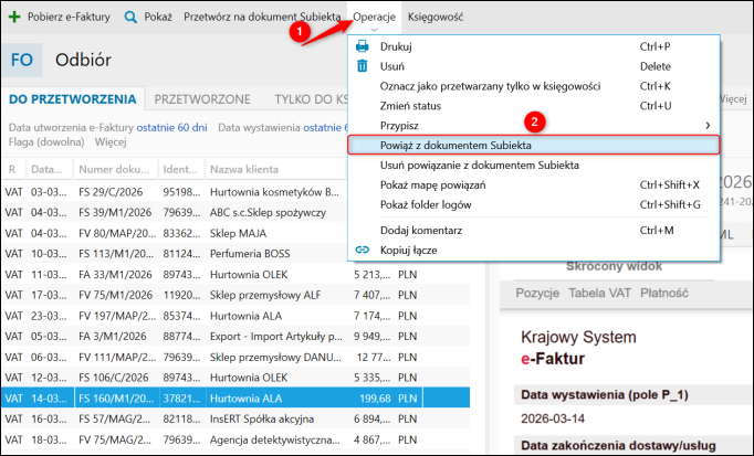 2. W górnym menu kliknąć Operacje i skorzystać z opcji Powiąż z dokumentem Subiekta.