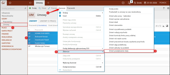 1. Przejść do modułu Umowy, zaznaczyć wybrane umowy, a następnie kliknąć z górnego menu Operacje – Zbiorczo – Zmień powiększanie staży.