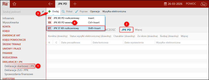 1. Przejść do modułu Deklaracje i JPK – Deklaracje skarbowe i JPK, uruchomić zakładkę JPK PD, z górnego menu wybrać Dodaj i skorzystać z opcji JPK ST KR Rozliczeniowy.