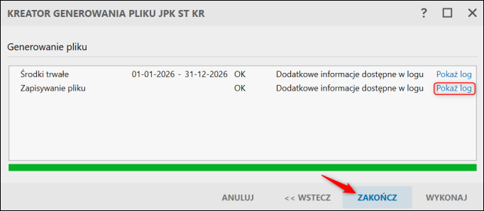 3. W przypadku poprawnego wygenerowania pliku kliknąć Zakończ. Jeśli natomiast pojawią się problemy, można skorzystać z opcji Pokaż log w celu ich identyfikacji.