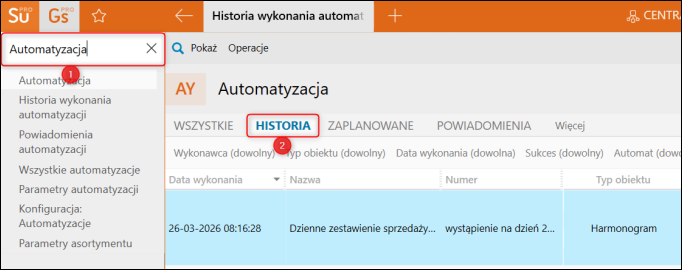1. Przejść do modułu Automatyzacja na zakładkę Historia.