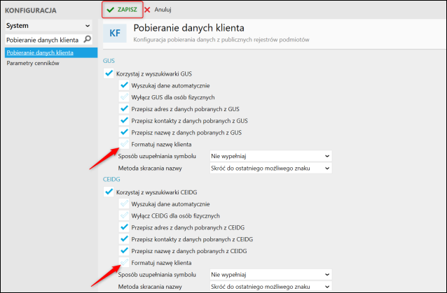 2. W sekcji GUS oraz CEIDG zaznaczyć opcję Formatuj nazwę klienta, zmiany Zapisać.