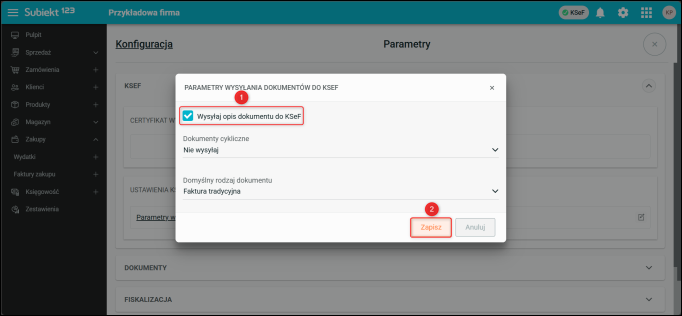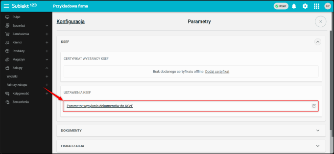 2. Otworzyć Parametry wysyłania dokumentów do KSeF.