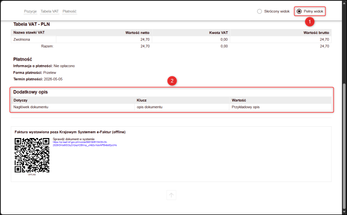 4. Opis dokumentu pojawi się w sekcji Dodatkowy opis na e-Fakturze.
