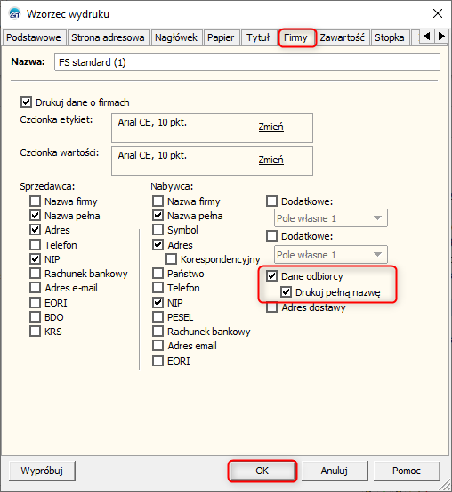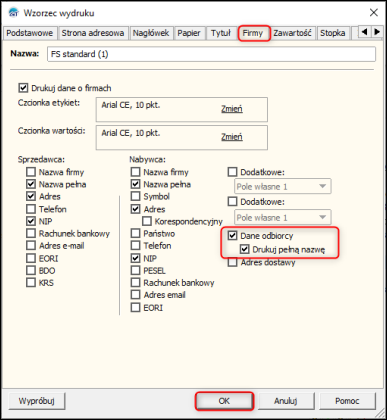 2. W oknie edycji wzorca w polu Nazwa można zmienić nazwę wzorca tak, aby łatwiej było go odróżnić. Następnie przejść do zakładki Firmy i zaznaczyć znaczniki Dane odbiorcy oraz Drukuj pełną nazwę. Zmiany zatwierdzić przyciskiem OK.