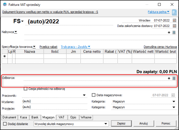 3. Przy wystawianiu faktury po uzupełnieniu danych należy przejść do zakładki Magazyn i w dolnej części wybrać odpowiedniego kontrahenta, który na wydruku ma widnieć w sekcji Odbiorca. Aby wyświetlić kontrahentów, należy kliknąć ikonę Lista.
