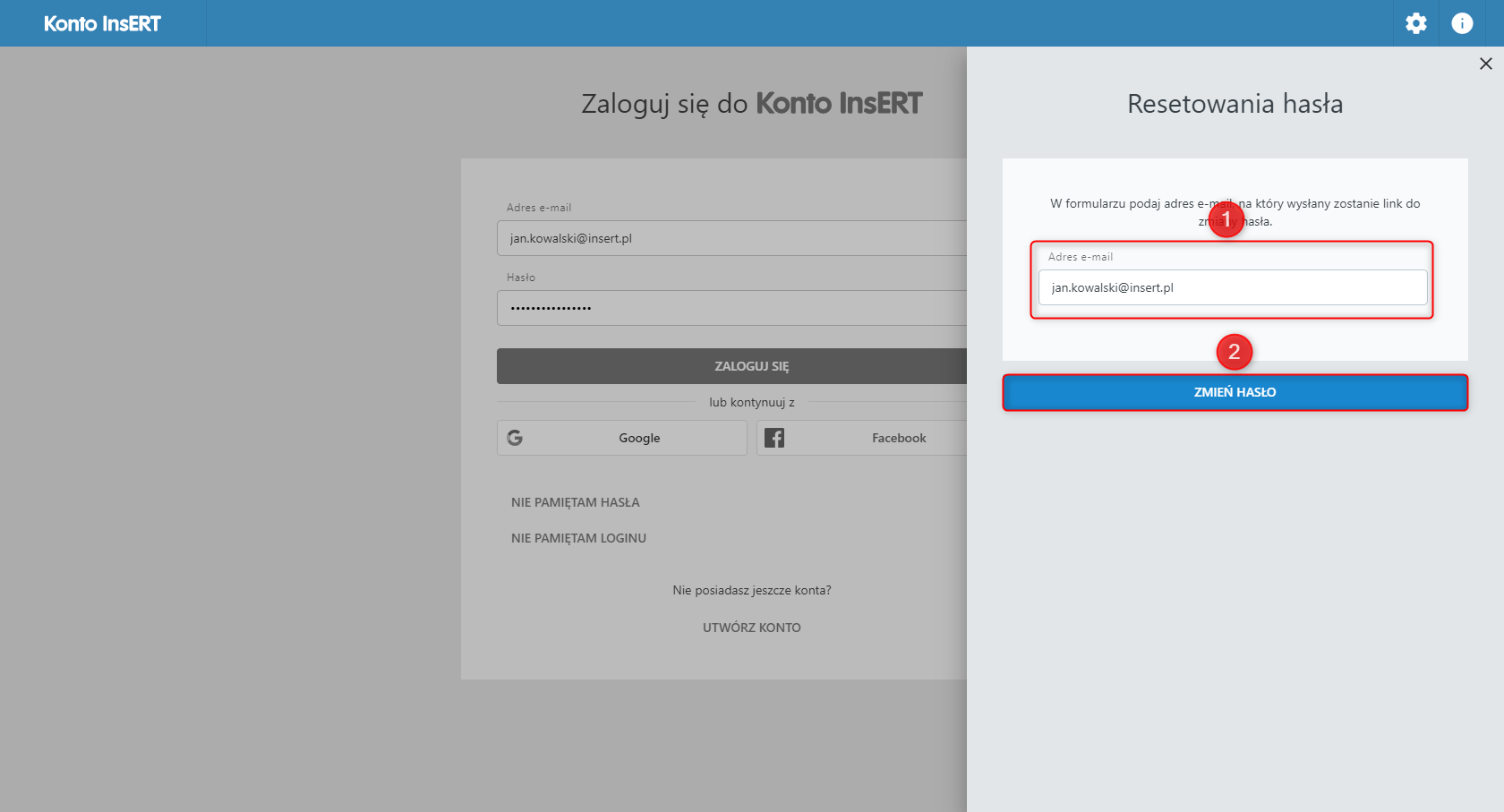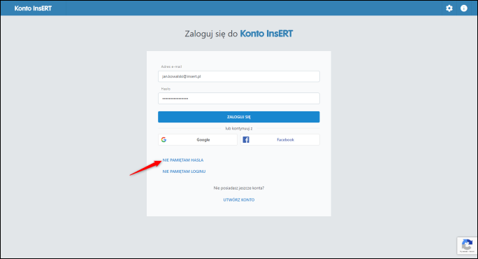 1. Przejść na stronę Konta InsERT. W sekcji logowania wybrać Nie pamiętam hasła.