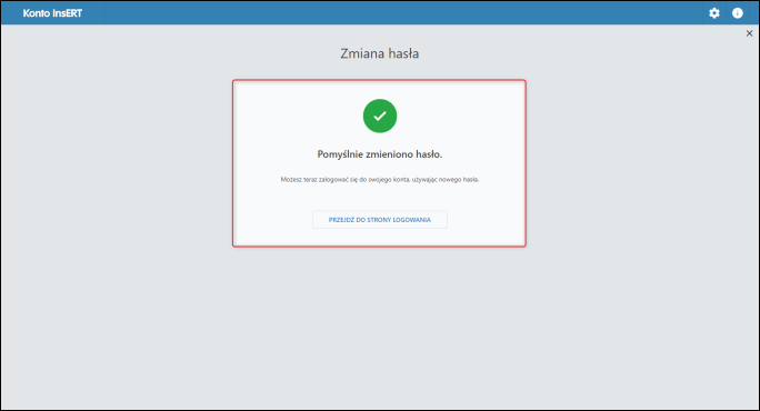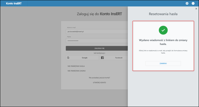 3. Zostanie wyświetlona informacja, aby przejść do konta e-mail, gdzie wysłany został link umożliwiający utworzenie nowego hasła dla Konta InsERT.
