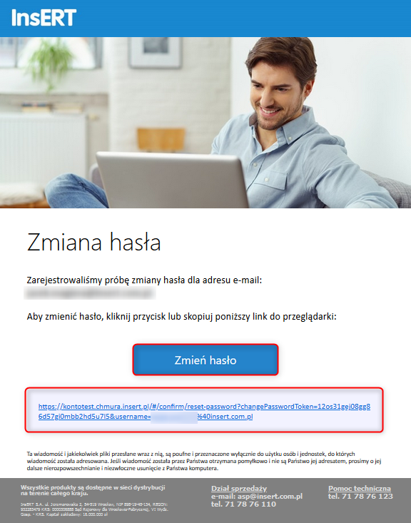 4. Na skrzynce pocztowej odnaleźć wiadomość e-mail o nazwie [InsERT] Zmiana hasła Konta InsERT, następnie kliknąć przycisk Zmień hasło lub skopiować link do przeglądarki.