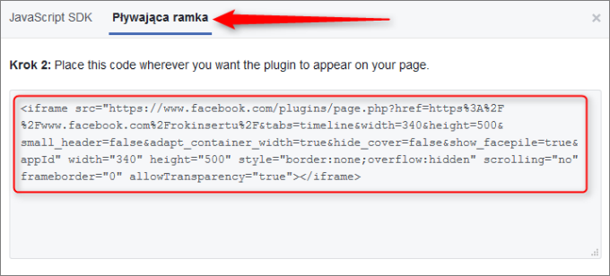 Wprowadzenie preferowanej strony Facebook oraz wybranie odpowiednich opcji sprawi, że utworzy się odpowiedni kod (w podanym przykładzie należy skorzystać z zakładki Pływająca ramka) której zawartość następnie należy skopiować.