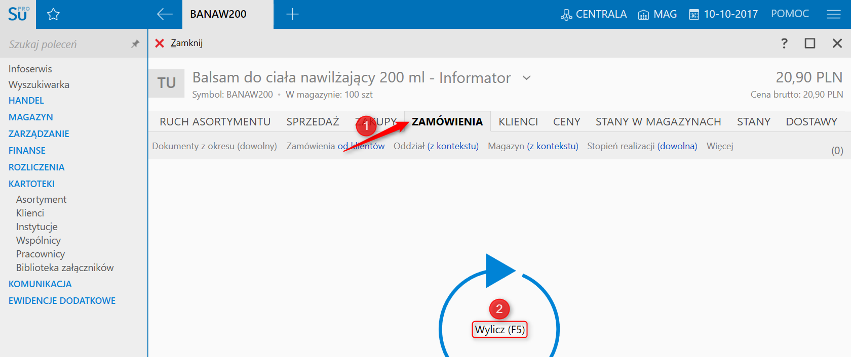 1. W informatorze danego towaru przejść na zakładkę Zamówienia i kliknąć Wylicz.