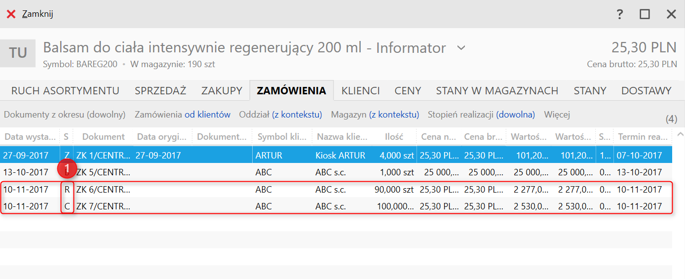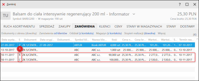 2. Sprawdzić w wyliczonym zestawieniu, które zamówienia mają status R – pełna rezerwacja dostaw lub C – częściowa rezerwacja dostaw.