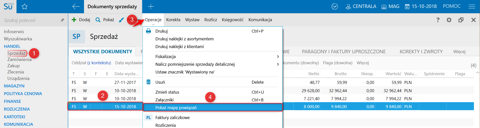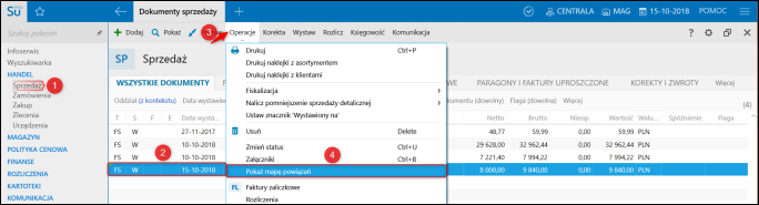 Od wersji 22 program Subiekt nexo umożliwia dostęp do Mapy powiązań. Pozwala ona znaleźć wszystkie dokumenty powiązane z danym dokumentem. Aby otworzyć Mapę powiązań, należy przejść do modułu dokumentów (na przykład Sprzedaż), zaznaczyć dokument, rozwinąć górne menu Operacje i wybrać Pokaż mapę powiązań.