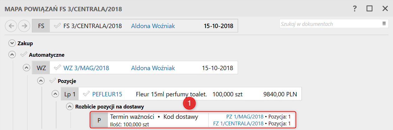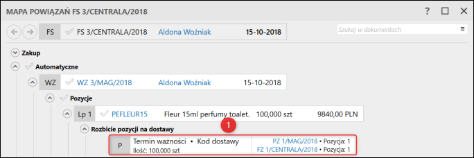 Na tym przykładzie (faktura sprzedaży), po rozwinięciu Automatyczne – Pozycje – Rozbicie pozycji użytkownik będzie miał dostęp do listy dokumentów, które wygenerowały przychód na towar rozchodowany sprawdzaną fakturą sprzedaży.