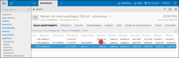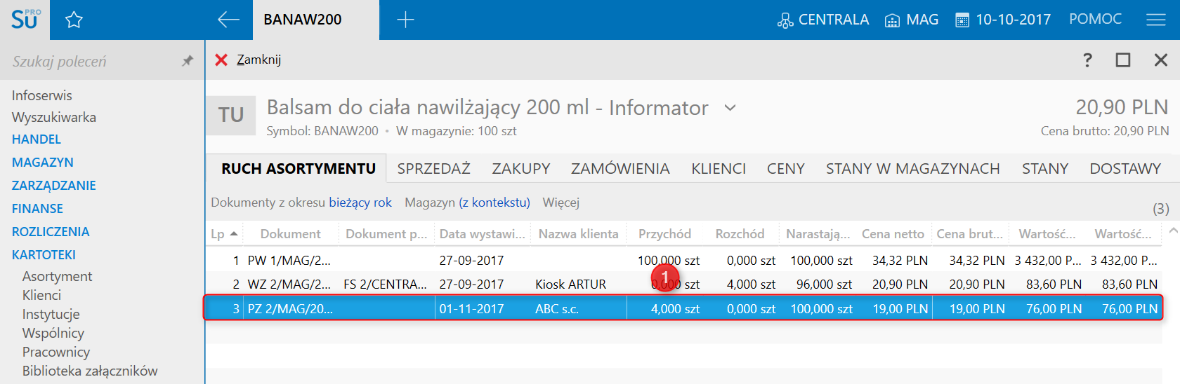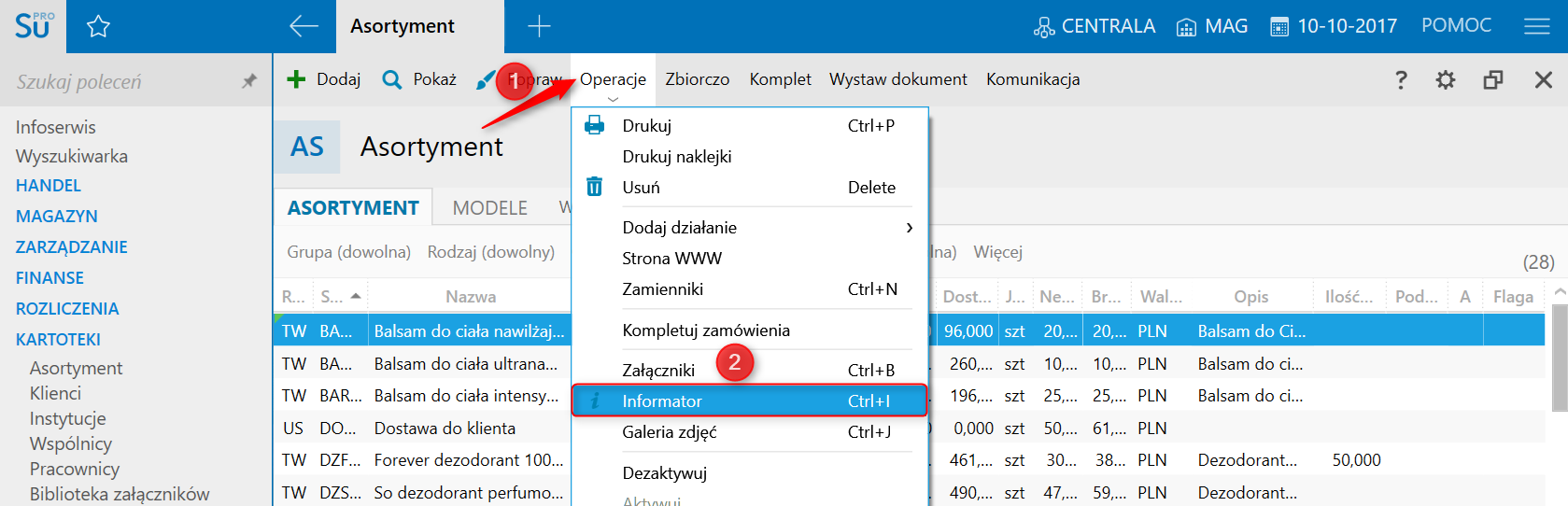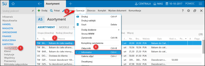 1. Przejść do modułu Asortyment, zaznaczyć odpowiedni towar, kliknąć górne menu Operacje i wybrać Informator.
