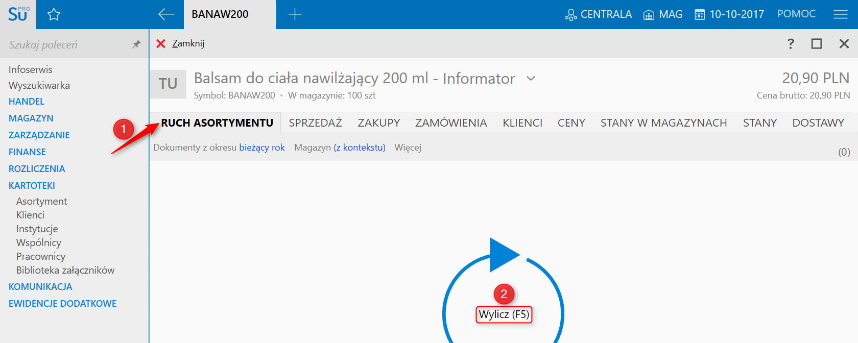 2. Na zakładce Ruch asortymentu kliknąć przycisk Wylicz.