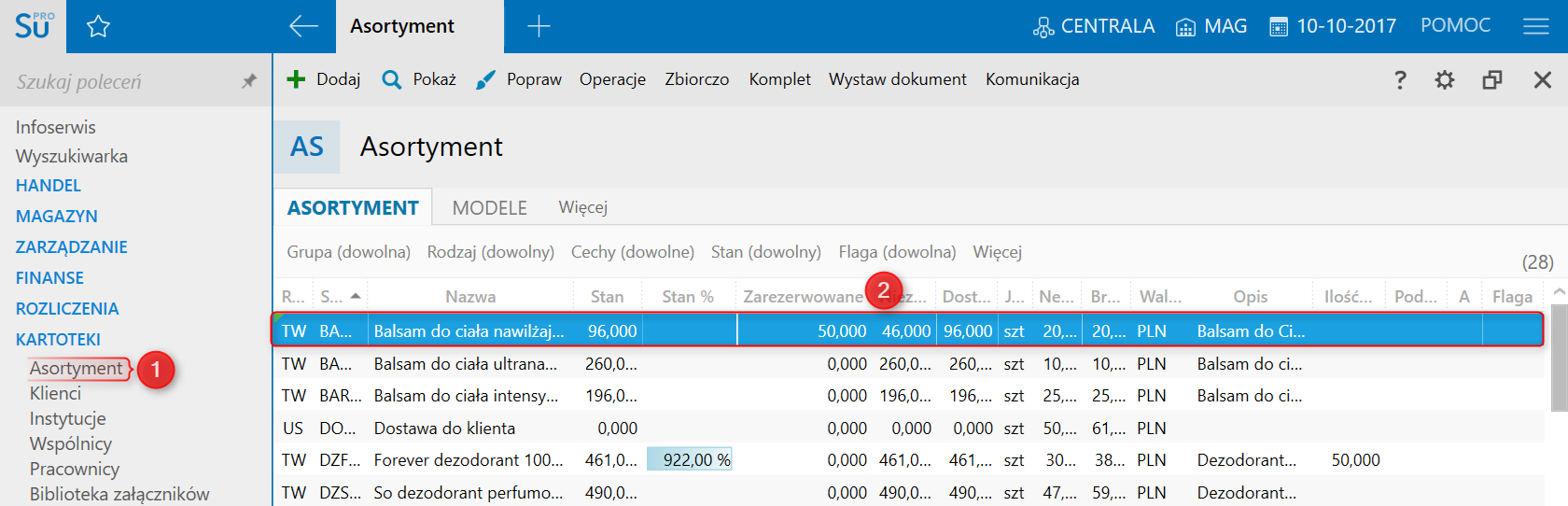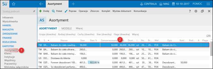 1. Przejść do modułu Asortyment i sprawdzić, czy w kolumnie Zarezerwowane jest informacja o zarezerwowanych stanach.