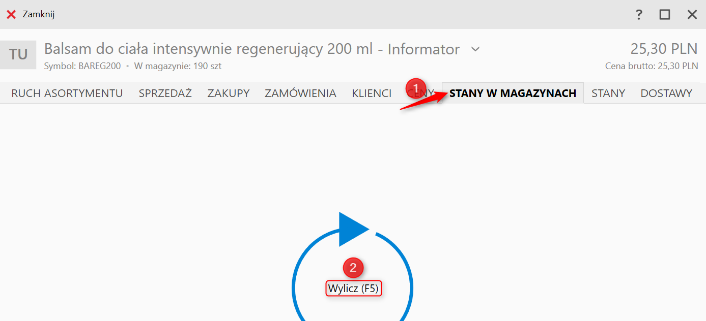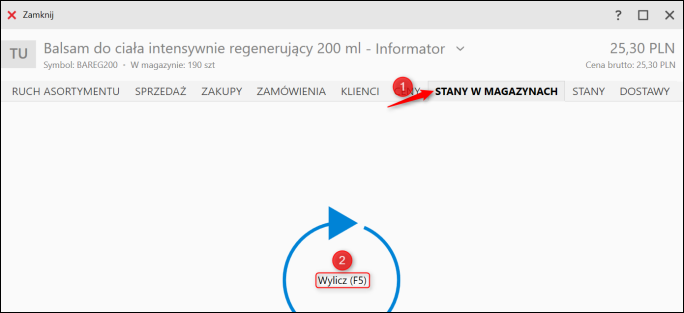 3. Przejść do zakładki Stany w magazynach i kliknąć Wylicz.