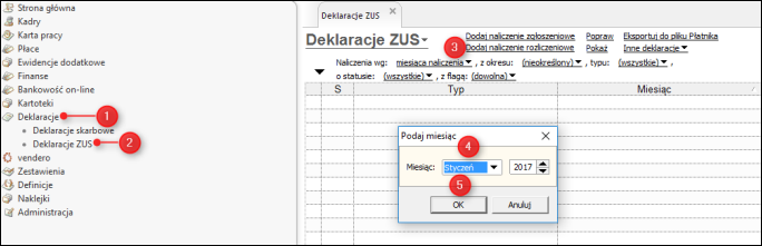 1. Z listy modułów wybrać Deklaracje – Deklaracje ZUS. Wybrać opcję Dodaj naliczenie zgłoszeniowe lub Dodaj naliczenie rozliczeniowe, wskazać miesiąc, za jaki chcemy wygenerować deklarację, a następnie wybrać opcję OK.