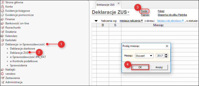 1. Z listy modułów wybrać Deklaracje, JPK i Sprawozdania – Deklaracje ZUS. Wybrać opcję Dodaj i wskazać miesiąc, za jaki chcemy wygenerować deklarację, a następnie wybrać opcję OK.
