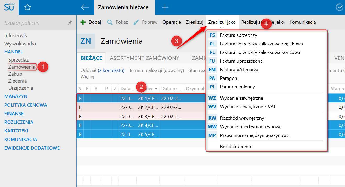 1. Przejść do modułu Zamówienia, a następnie zaznaczyć na liście dokumenty ZK do przetworzenia. Z górnego menu wybrać Zrealizuj jako i wskazać typ dokumentu. W omawianym przykładzie zamówienia zostaną zrealizowane dokumentem faktury sprzedaży.