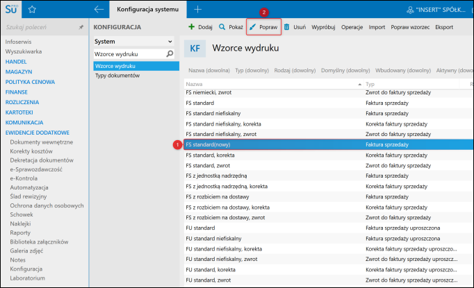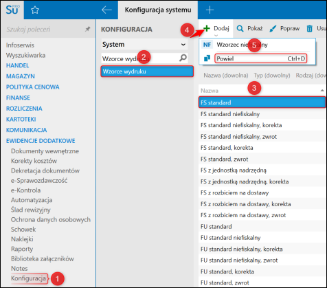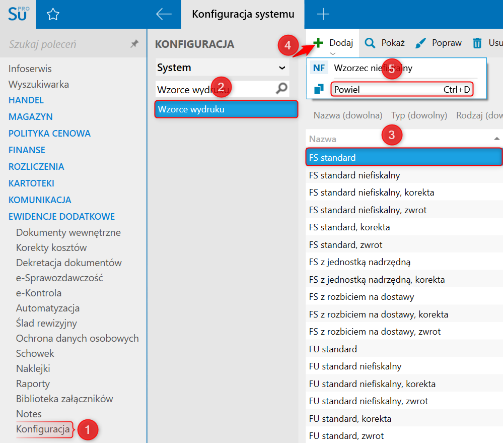 1. Przejść do modułu Konfiguracja – Wzorce wydruku. W kolejnym kroku należy odszukać wzorzec, który ma zostać zmodyfikowany, a następnie zaznaczyć go i wybrać z górnego menu Dodaj – Powiel.
