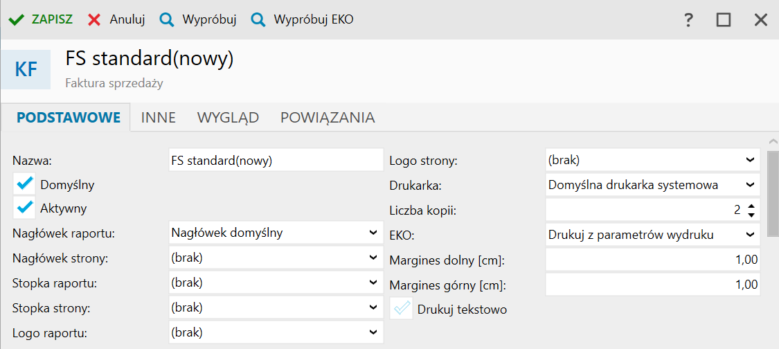 Po wciśnięciu Popraw istnieje możliwość ustawienie wzorca wydruku jako Domyślny. Spowoduje to, że program dla wybranego typu dokumentu przy wydruku wybierze ten wzorzec jako pierwszy. W tym miejscu istnieje również możliwość ustawienia Nagłówka, Stopki oraz Logo raportu i strony, a także domyślnej Drukarki, Liczby kopii oraz Dostosowania szerokości marginesów lub też ustawienie Wydruku tekstowego.