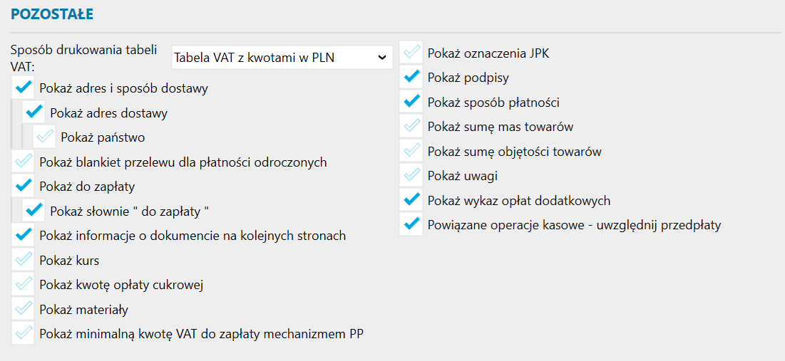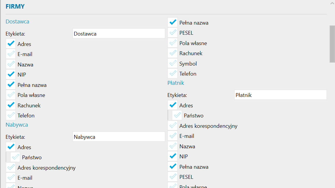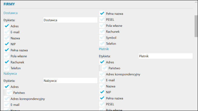 W sekcji Firmy istnieje możliwość określenia, jakie informacje o Dostawcy, Nabywcy, Odbiorcy, Płatniku czy Zamawiającym mają być widoczne na wydruku.