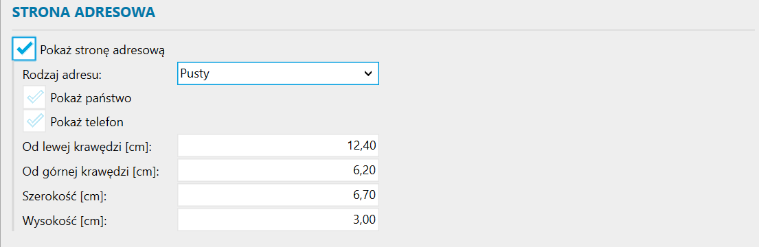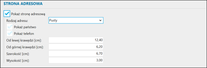 Zaznaczenie parametru Pokaż stronę adresową spowoduje dodanie do wydruku kolejnej strony, na której widoczny będzie wskazany Rodzaj adresu. Dodatkowo istnieje możliwość dołączenia Państwa i Numeru telefonu oraz ustawienia, w którym miejscu mają znajdować się dane. Natomiast w sekcji Tytuł można ustawić, w jaki sposób ma być wyświetlony tytuł dokumentu (oryginał, kopia, miejsce na pieczątkę), a także Nadpisać domyślny tytuł dokumentu.