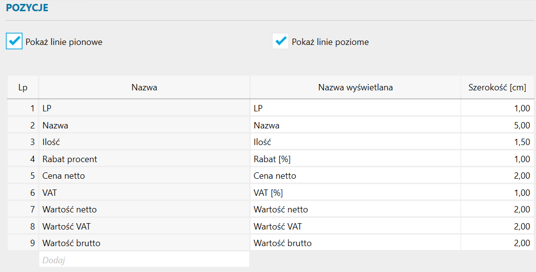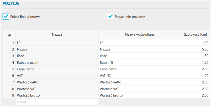 W sekcji Pozycje można Włączyć/Wyłączyć linie pionowe i poziome. W tabeli istnieje możliwość Dodania, Usunięcia oraz Zmiany kolejności i Ustawienia szerokości kolumn.
