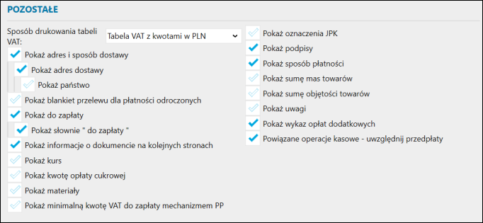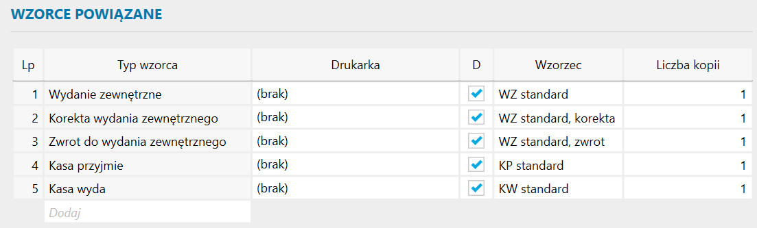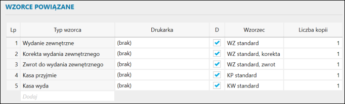 Zaznaczenie wybranego pola znajdującego się w sekcji Pozostałe spowoduje, że będzie widoczny na wydruku. Wzorce powiązane są to wzorce, które drukują się wraz z wybranym typem dokumentu. Oznacza to, że jeśli np. na wzorcu wydruku FP standard (nowy) w sekcji Wzorce powiązane znajduje się wzorzec dla dokumentu Kasa przyjmie, oraz posiada on zaznaczony parametr w kolumnie D (Domyślnie drukuj), wraz z wydrukiem Faktury pro forma zostanie wydrukowany dokument KP.