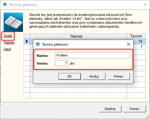 2. Przy pomocy przycisku Dodaj utworzyć nową formę płatności. Wprowadzić nazwę Przelew, można też dodać nazwę banku (np. Przelew ING). Termin jest domyślną liczbą dni do zapłaty, którą przy wystawianiu faktury można edytować. Utworzenie formy płatności zatwierdzić przyciskiem OK, a następnie zamknąć słownik Terminy płatności przyciskiem Zamknij.