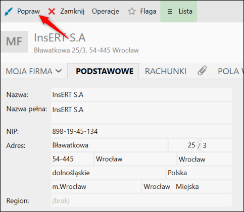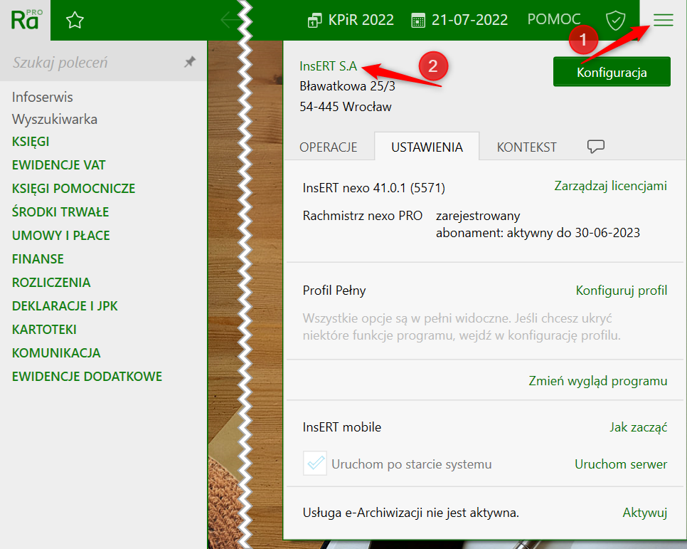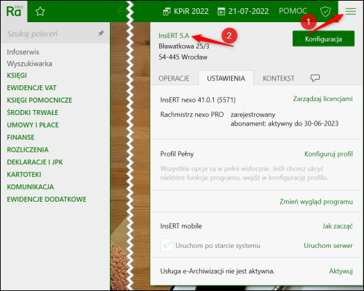 1.  W prawym górnym rogu okna programu wejść w ikonę „drabinki" , a następnie w nazwę firmy.