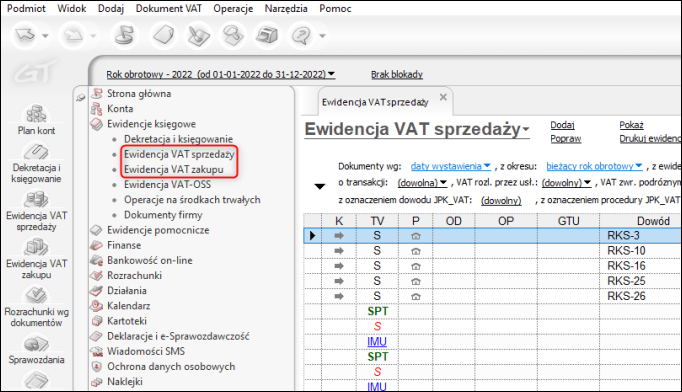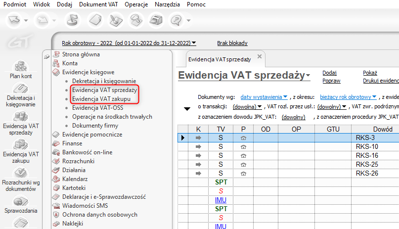 1. Wejść do modułu Ewidencje księgowe – Ewidencja VAT sprzedaży lub Ewidencja VAT zakupu.