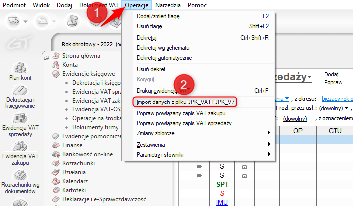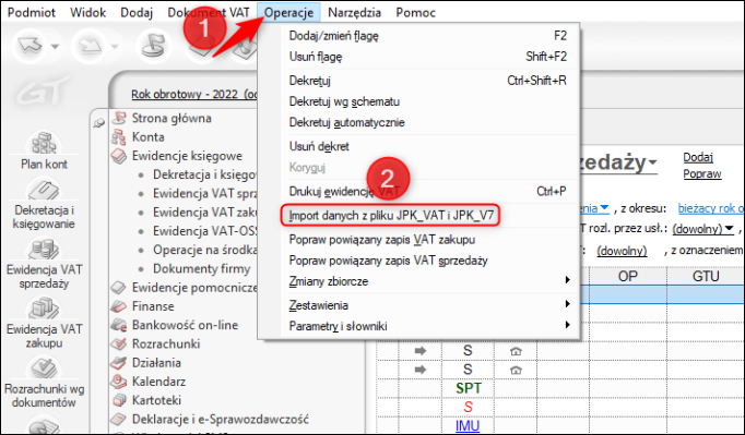 2. Z górnego menu Operacje wybrać Import danych z pliku JPK_VAT i JPK_V7.