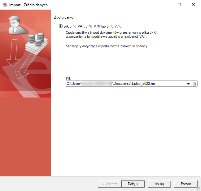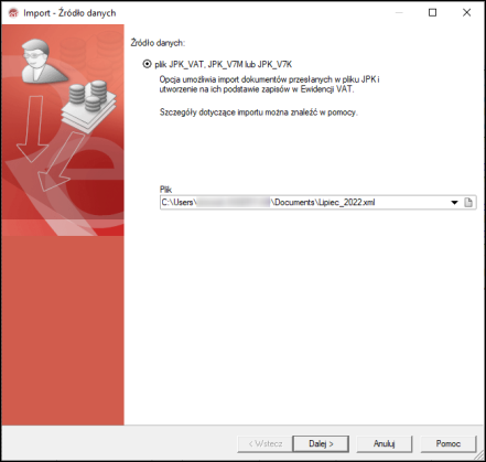 3. W polu Plik wybrać zapisany na komputerze plik JPK_VAT lub JPK_V7, a następnie kliknąć Dalej.