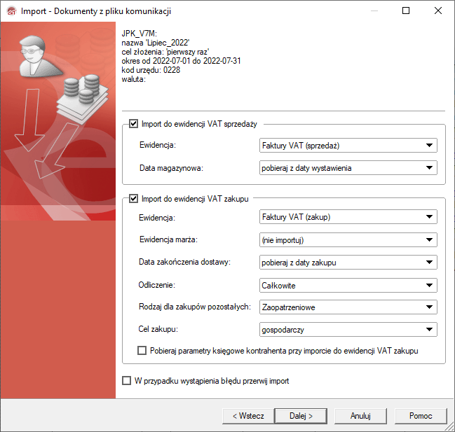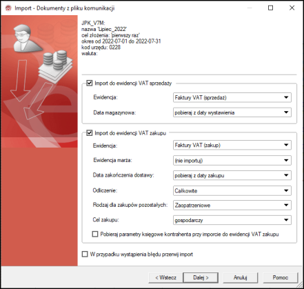 Przy wybraniu Importu do ewidencji VAT sprzedaży należy dodatkowo określić: