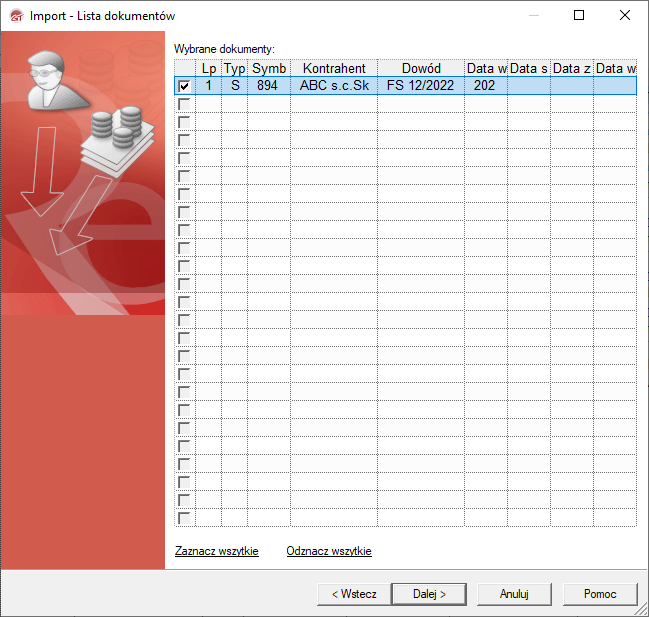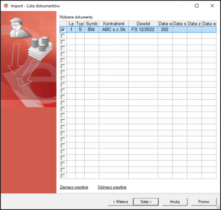 5. Zaznaczyć z listy dokumenty, które podlegają importowi, a następnie kliknąć Dalej,