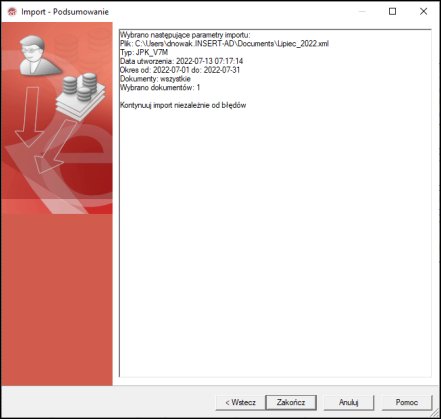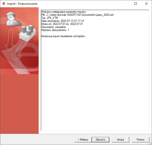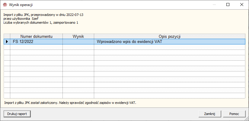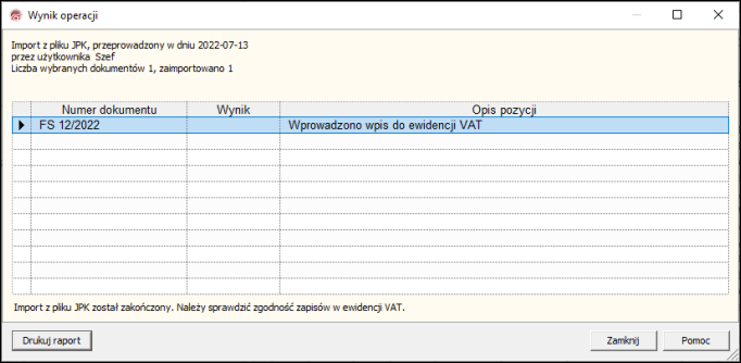 7. Po imporcie program wyświetli raport zawierający Wynik operacji. Raport można wydrukować lub zamknąć.