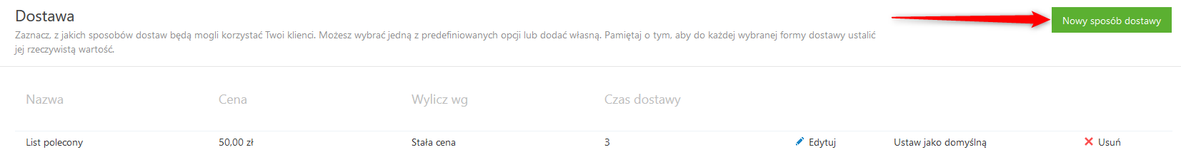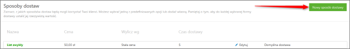 Dodanie ich następuje z poziomu Panelu Administracyjnego vendero, z menu Ustawienia – Dostawa poprzez widoczny w prawym górnym rogu Nowy sposób dostawy.