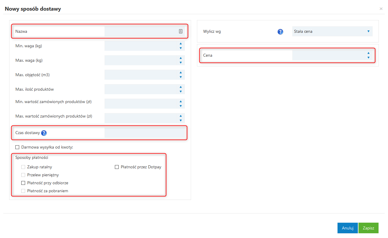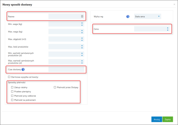 Należałoby następnie odpowiednio uzupełnić pojawiające się pola – pamiętając zarazem, ze Nazwa, Cena, Czas dostawy oraz Sposoby płatności są obowiązkowe do wypełnienia. Szczegółowe informacje dostępne są w osobnym temacie e-pomocy.