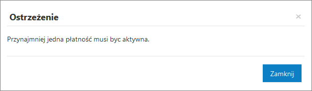 Po pierwszym utworzeniu witryny, bądź też ponownym jej podłączeniu żadna z nich nie będzie aktywna, ale po wskazaniu jednej z dostępnych płatności program nie pozwoli na kompletne wyłączenie tego modułu. Dzieje się tak oczywiście ze względu na konieczność jej wskazania przy procesie sprzedażowym w sklepie.