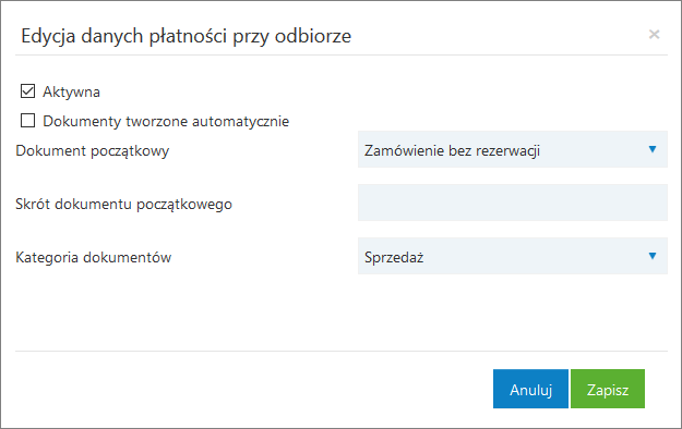 - znacznik Dokument początkowy pozwala wskazać, czy w systemie sprzedażowym ma być tworzone Zamówienie z rezerwacją, czy Zamówienie bez rezerwacji, jest to pole wymagane;
